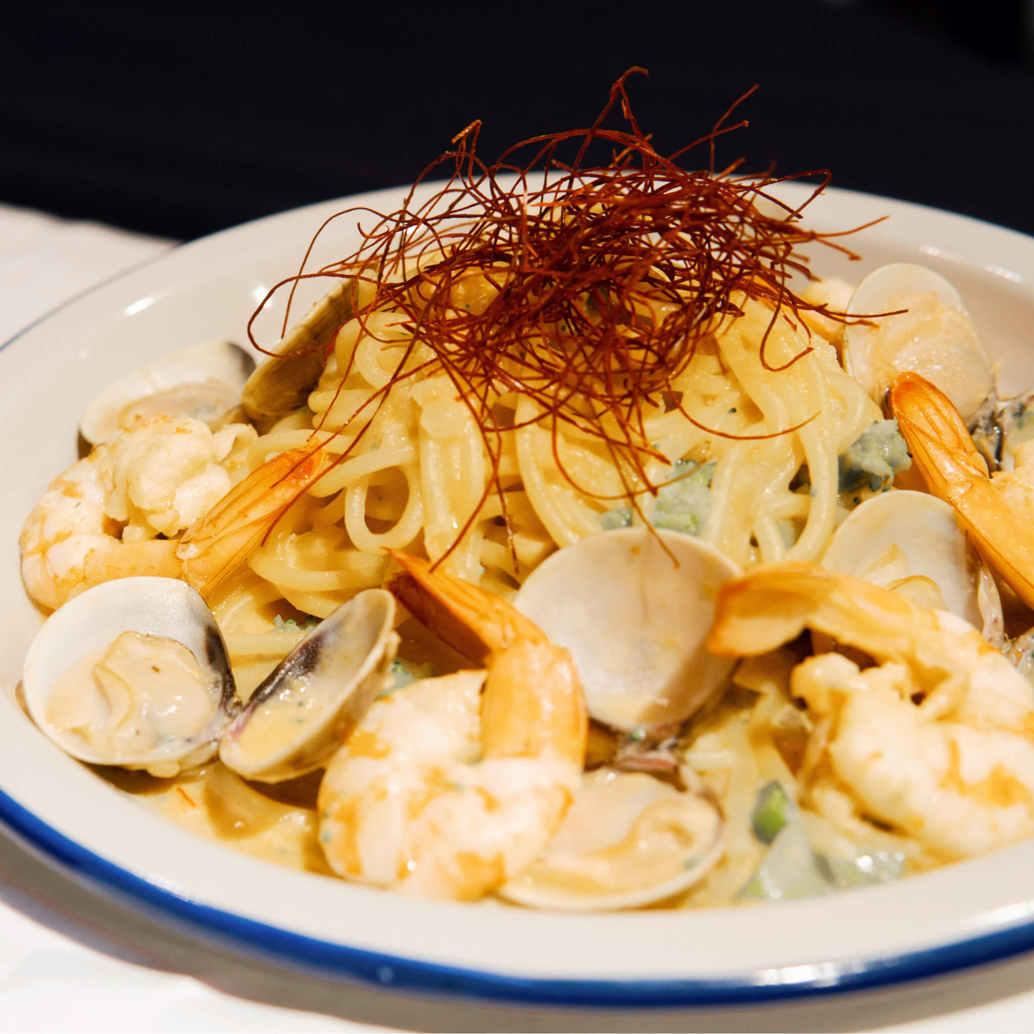 蝦、蛤蜊、調和式粉紅醬、義大利直麵、紅椒絲